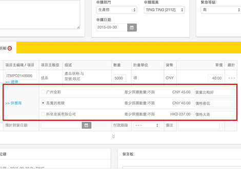 • 在申購流程中,採購員可按每款產品建議最合適的供應商並附上理據,方便部門主管在審批時更方便快捷