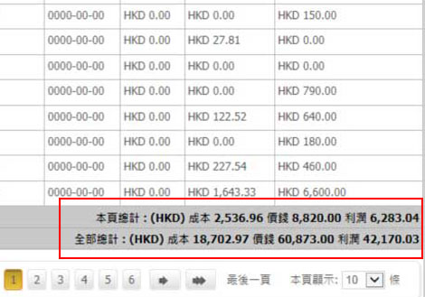 根據搜索出來的結果,以列表形式顯示,並附上總計、成本、利潤等數據